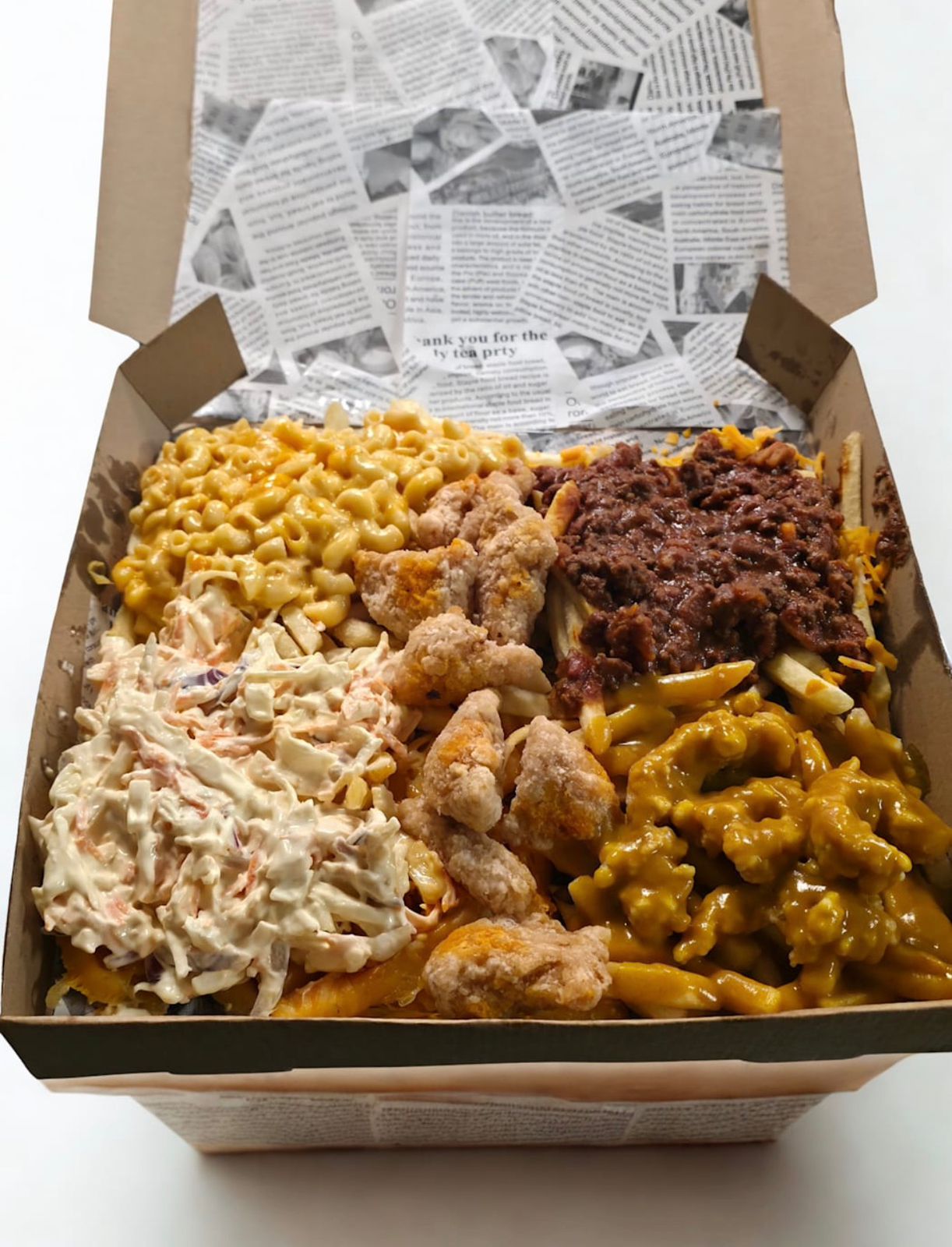 Price range: £19.99 through £27.00Price range: £19.99 through £27.00A full bed of chips topped with macaroni cheese, chilli con carne, chicken curry, salt & pepper chicken, three-cheese mix & coleslaw. -