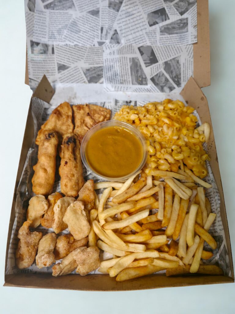 Macaroni cheese, chicken nuggets, cheese balls, battered sausage, pizza crunch, chips & sauce.